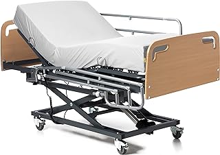 - Cama articulada asistencial con elevador, ruedas con freno, barandillas abatibles, cabecero/piecero y colchón sanitario viscoelástico